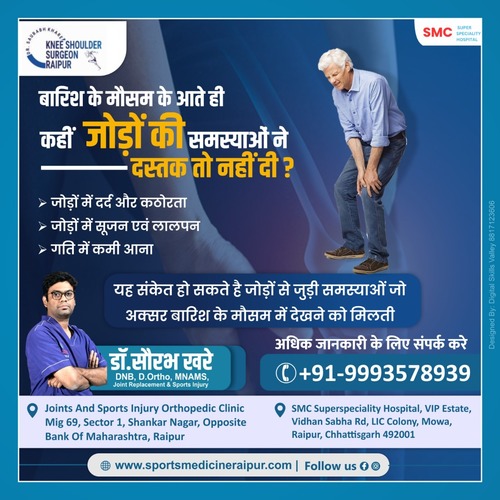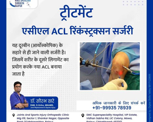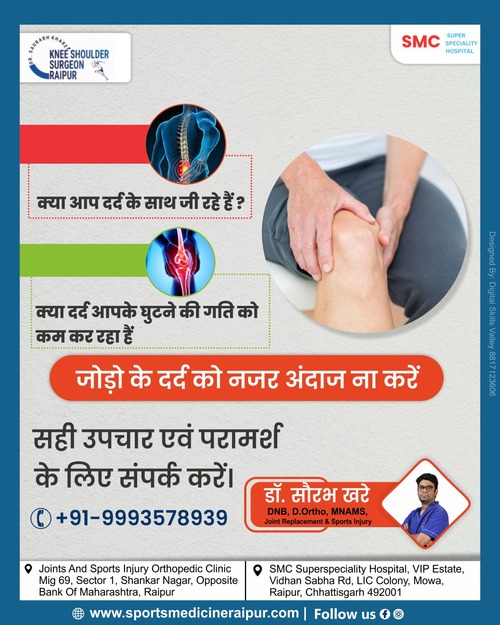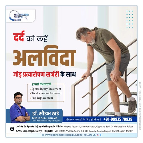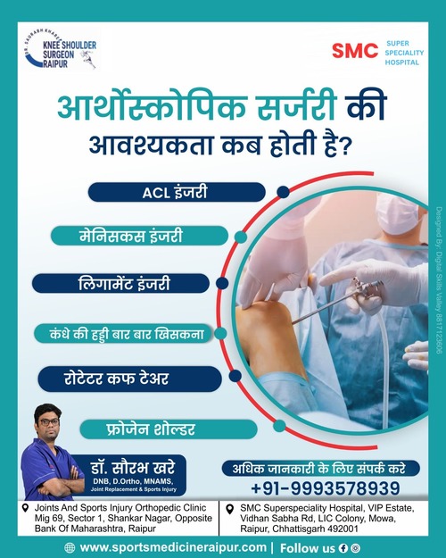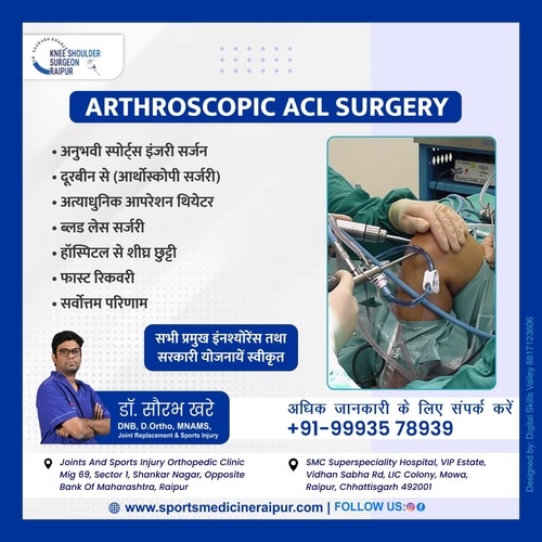 Best Joint Replacement Doctor I Arthroplasty Doctor I Best ACL Surgery I Ligament Surgery I ACL I Sports Surgeon I Best ACL Surgeon I ACL Doctor I Best Knee Surgeon I Best Shoulder Surgeon I Best Arthroscopic Doctor I Ligament Injury I Top ACL Surgeon I Shoulder dislocation Treatment I MPFL Tear I Total Knee Replacement I Total Hip Replacement I Best Orthopedic Doctor I Best Orthopaedic doctor I Dr. Saurabh Khare is an experienced Orthopedic Surgeon who has been practicing in Raipur. His fields of interest are Joint replacement surgeries and minimally invasive Arthroscopic surgeries. Dr Khare works closely with his patients to ensure they receive the best possible care and offers personalized treatments tailored to each individual's needs.