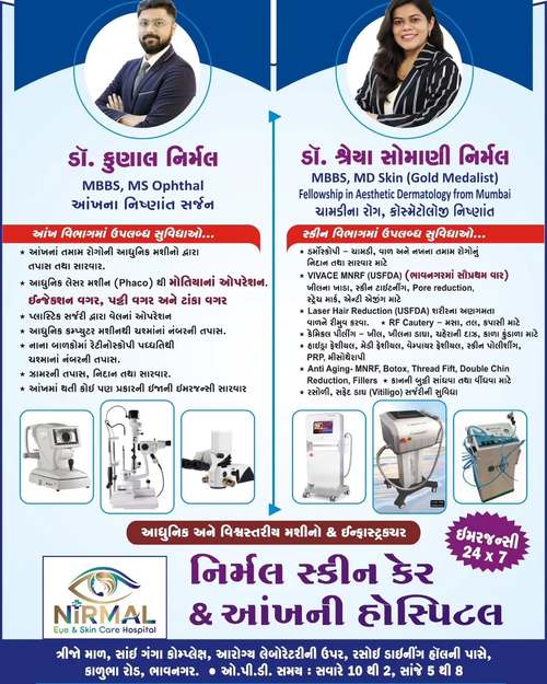 Nirmal Skin Care Clinic in Bhavnagar provides advanced solutions for all skin, hair, and nail concerns. From acne, pigmentation, and anti-aging treatments to expert care for psoriasis, eczema, and allergies, we offer complete dermatology services. Under the guidance of Dr. Shreya Somani Nirmal, Gold Medalist Dermatologist, the clinic is renowned for cosmetic dermatology, including Botox, fillers, and laser treatments. Achieve radiant, healthy, and youthful skin with personalized care. Book your appointment today at Nirmal Skin Care Clinic for visible and lasting results