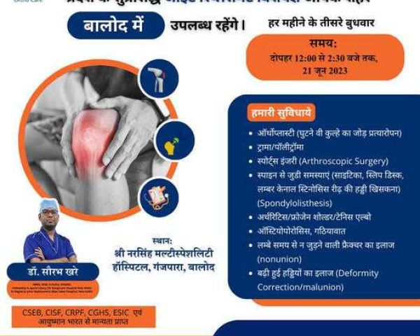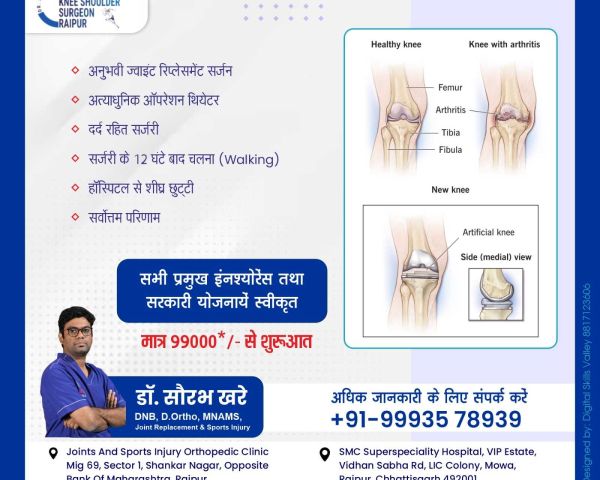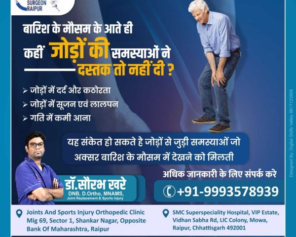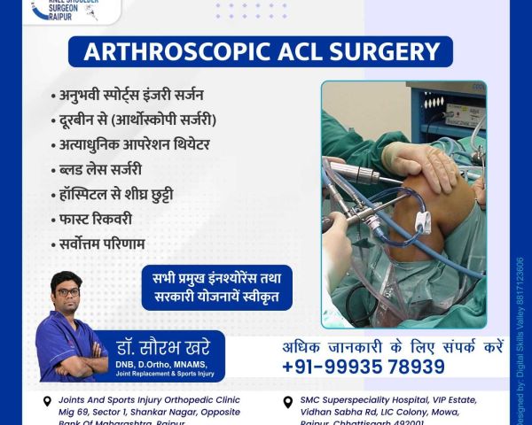 Best Joint Replacement Doctor I Arthroplasty Doctor I Best ACL Surgery I Ligament Surgery I ACL I Sports Surgeon I Best ACL Surgeon I ACL Doctor I Best Knee Surgeon I Best Shoulder Surgeon I Best Arthroscopic Doctor I Ligament Injury I Top ACL Surgeon I Shoulder dislocation Treatment I MPFL Tear I Total Knee Replacement I Total Hip Replacement I Best Orthopedic Doctor I Best Orthopaedic doctor I Dr. Saurabh Khare is an experienced Orthopedic Surgeon who has been practicing in Raipur. His fields of interest are Joint replacement surgeries and minimally invasive Arthroscopic surgeries. Dr Khare works closely with his patients to ensure they receive the best possible care and offers personalized treatments tailored to each individual's needs.